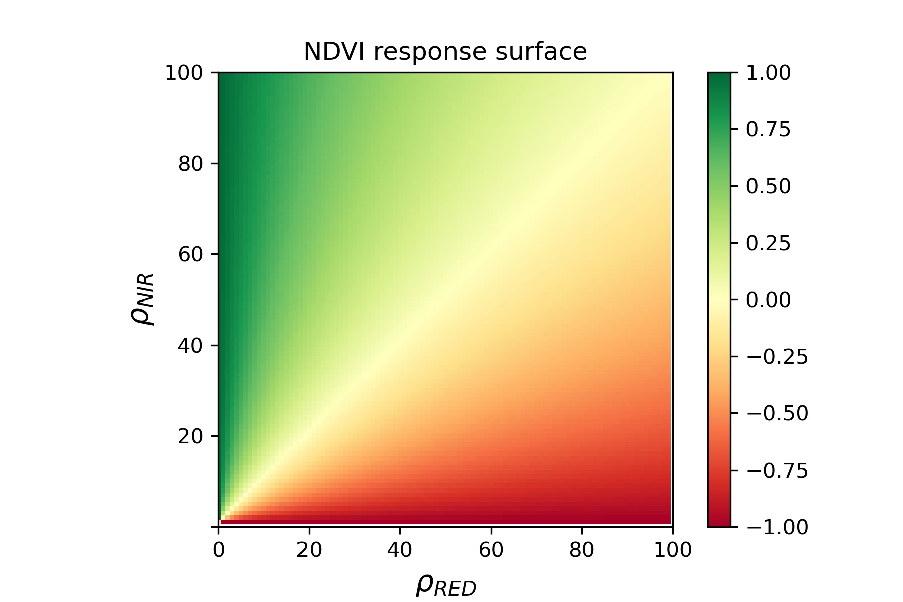 The NDVI relates the difference between the NIR and red reflectance to their sum.