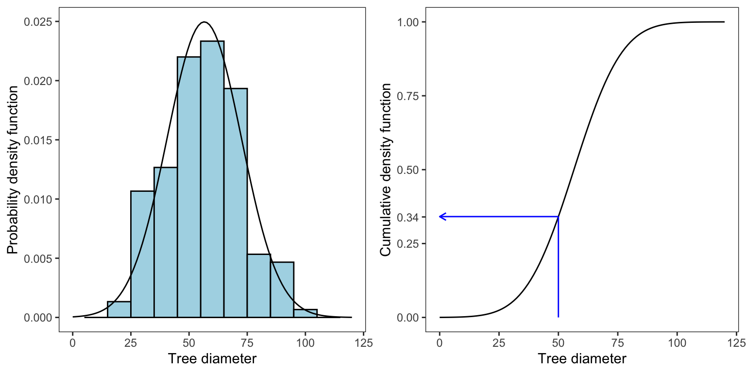 We can plot the estimated normal \(pdf\) on top of the sample distribution, and we can also plot the cumulative density function (\(cdf\)). We can then grab from the \(cdf\), the probability that a tree has a DBH of up to \(x\), i.e., \(P(X\leq x)\). For example, there is a 0.34 probability that a tree in Pinewood is less than or equal to 50 cm.