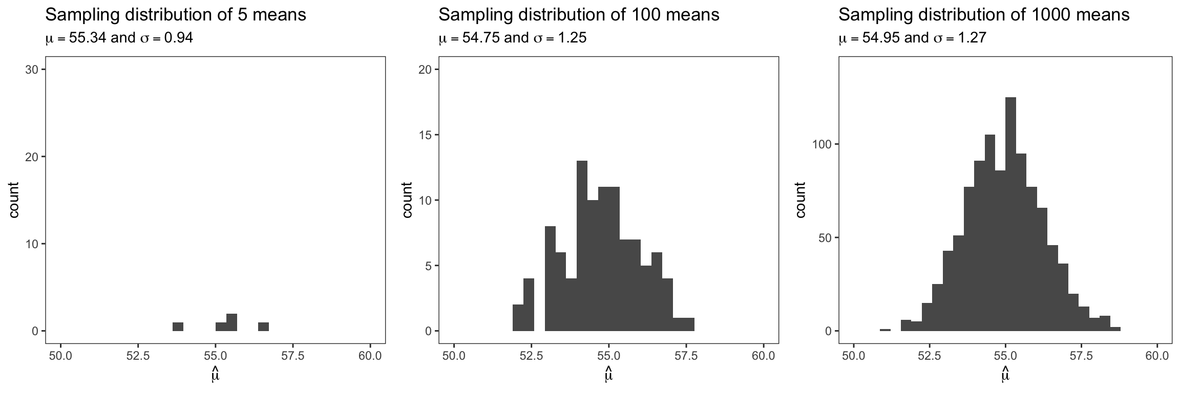 We just used a sample (of trees) to estimate the parameters \(\hat{\mu}\) and \(\hat{\sigma}\) of the probability density distribution of the tree population in Pinewood. Since a sample usually represents a fraction of the population, our estimates have uncertainties associated with them. We can illustrate this using the following theoretical construct: If we repeated the sampling, we would obtain a different estimate every time we collected a new sample. Let’s assume we repeatedly sampled 150 trees 5 times, 100 times, and 1000 times, respectively. We would get 5, 100, and 1000 sample means, respectively. The next figure shows the distribution of these sample means (NOT the distribution of individual trees). Such a distribution is called the sampling distribution (of the mean diameter). The more often we repeat the sampling the more closely the distribution of the means resembles a normal distribution (Central Limit Theorem). Hence, we can describe the sampling distribution itself with a normal distribution, with a mean and a standard deviation.