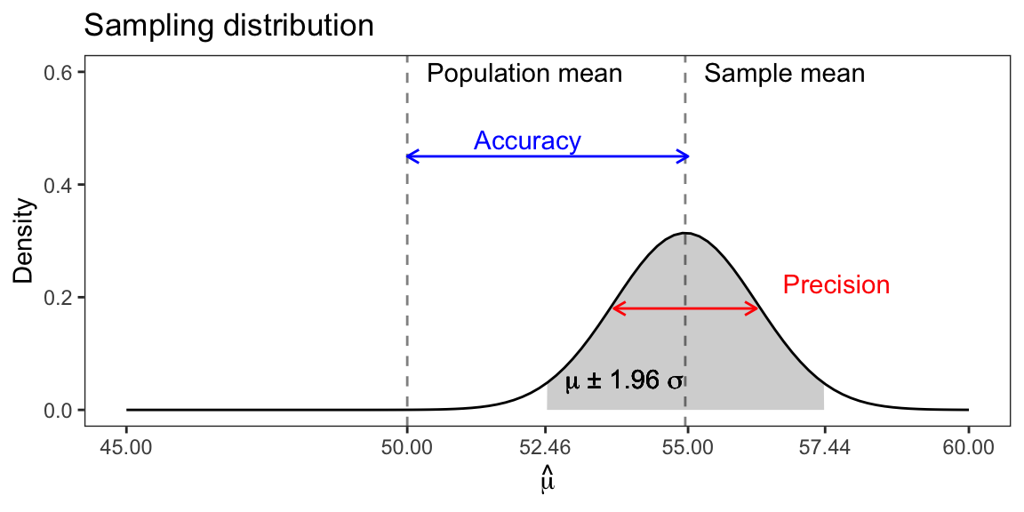 It is important to understand that we do not know the location of the true parameter, here the population mean. So, we cannot say how close our estimate is to the true value. We can say that our estimate is within a range of estimates that we would obtain if we would repeat the sampling. A precise estimate with a low sampling variance is not necessarily an accurate estimate. If the sample is biased, the true mean may lie outside the sampling distribution. Typically, we can reduce or eliminate bias through the choice of sampling and the choice of estimators. In Pinewood, we employed random sampling, and the sample mean is an unbiased estimator of the population mean, if the underlying population follows a normal distribution.