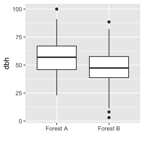 To test this, we formulate a precise null hypothesis \(H_{0}\): The mean DBH is equal among both samples, that is \(\overline{x}_{sp1} = \overline{x}_{sp2}\)