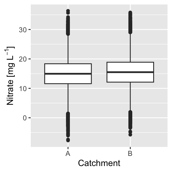 Both sampels are taken from intensive measurement sites, with n = 100,000 and a sampling error of 0.3 \(mg L^{-1}\). Do you think the difference in Nitrate concentration is substantial?