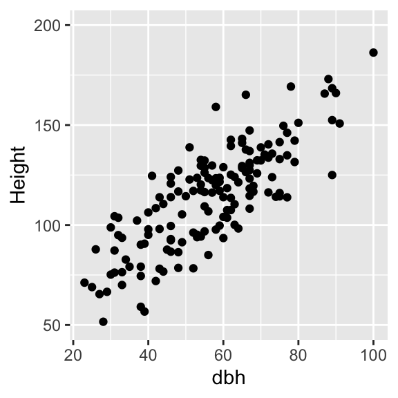 Calculating the Pearson correlation coefficient for our examples yields \(r_{xy}=0.8\), which indicates a strong positive relationship between DBH and height.
