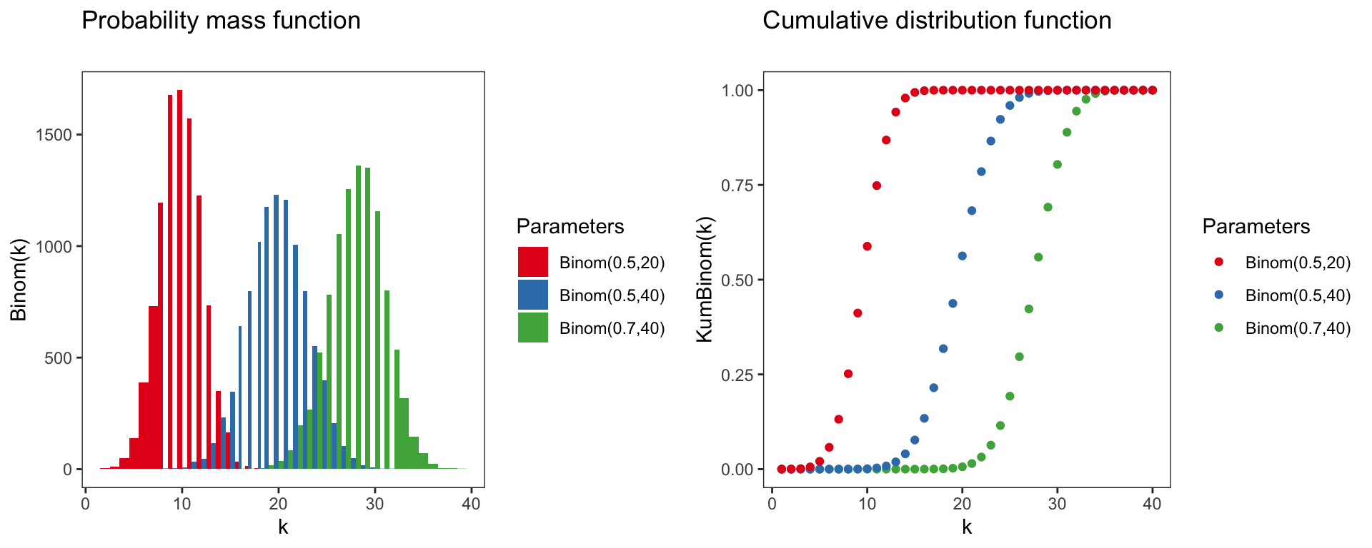 \(\begin{aligned} Binom(k) = (X=k \mid p,n) = \begin{pmatrix} n \\ k \end{pmatrix} p^{k}(1-p)^{n-k} \end{aligned}\)