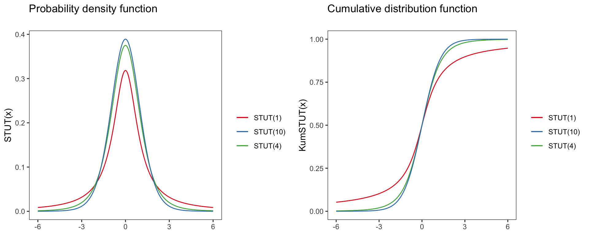 \(\begin{aligned} STUT(x) = (X=x \mid v) = \frac{B(\frac{v+1}{2})}{\sqrt{v*\pi}B(\frac{v}{2})}(1+\frac{x^{2}}{v})^{-\frac{v+1}{2}} \end{aligned}\)