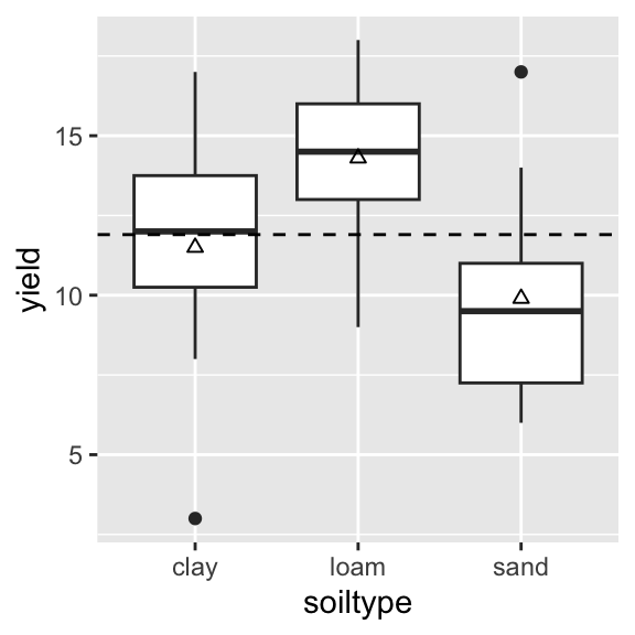 geom_point(data = yields_tidy_summary, aes(x = soiltype, y = mean), shape = 2)