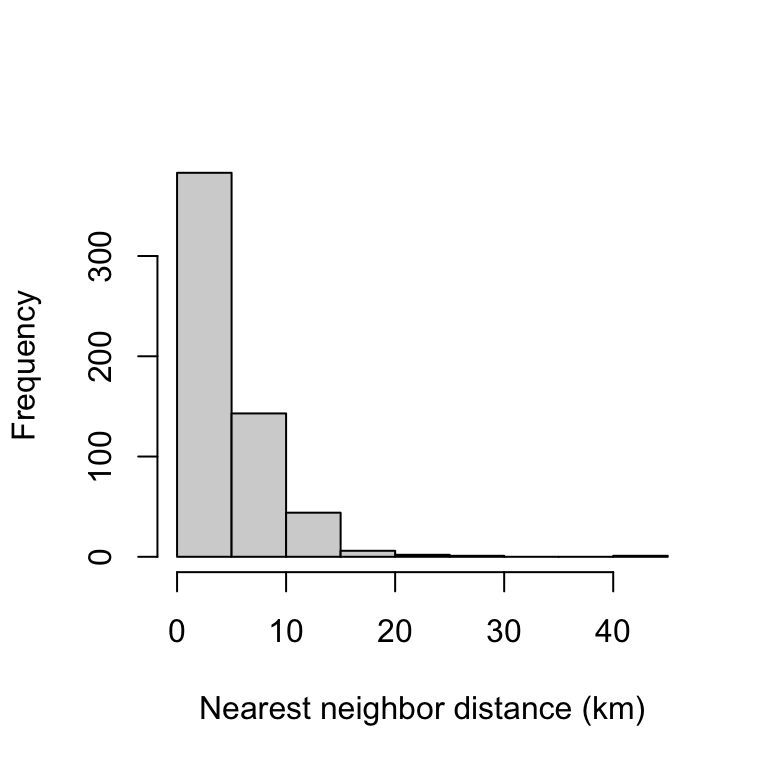 Specifically, the curves shows that \(\hat{G}(r)=0.5\) is achieved at about r=4, which means that 50% of the nearest-neighbor distances were 4 km and shorter.
