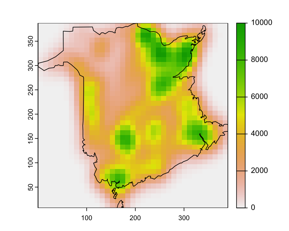 fire_kde <- spatialEco::sf.kde(fires, bw = c(bw_x, bw_y), res = mapres,