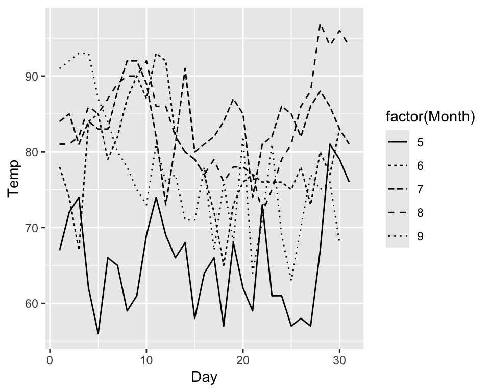 ggplot(data = airquality, aes(x = Day, y = Temp, linetype = factor(Month))) +