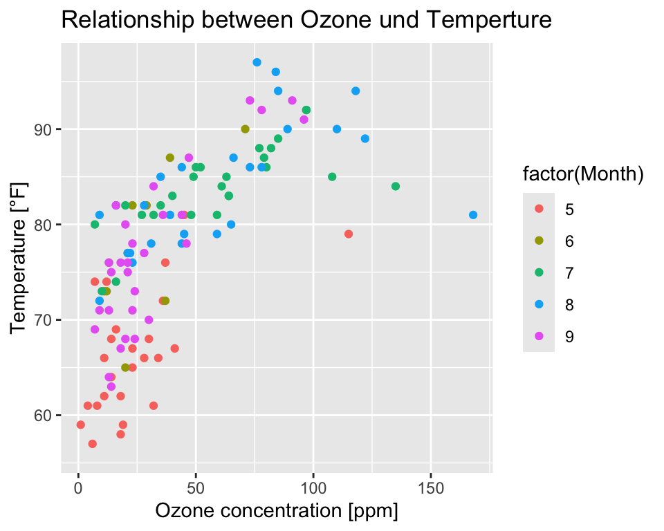 p <- ggplot(data = airquality, aes(x = Ozone, y = Temp, col = factor(Month))) +