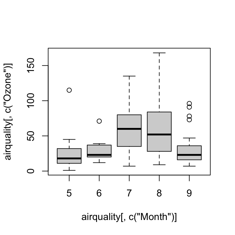 boxplot(airquality[ , c("Ozone")] ~ airquality[ , c("Month")])