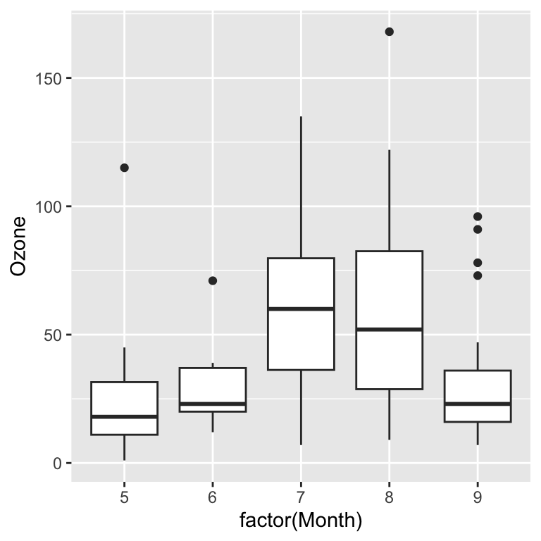 ggplot(data = airquality, aes(x = factor(Month), y = Ozone)) +