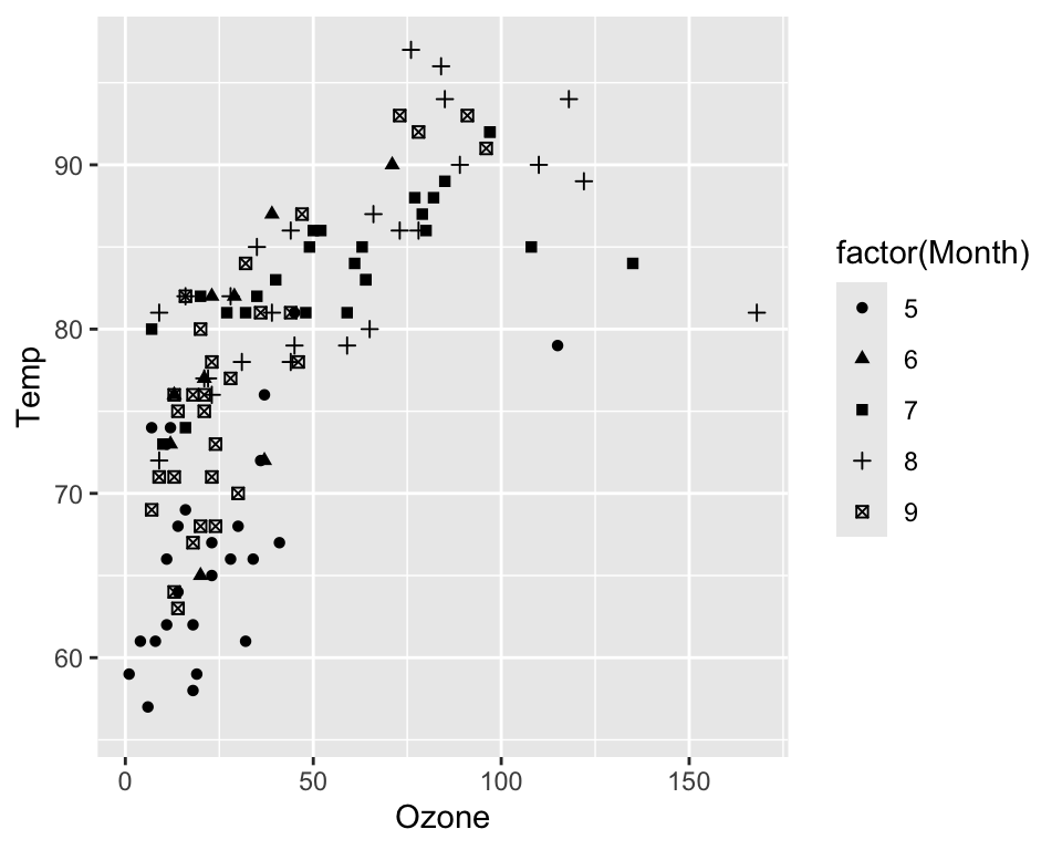 ggplot(data = airquality, aes(x = Ozone, y = Temp, shape = factor(Month))) +