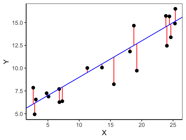 where \(y_i\) is the \(i\)’th response, \(\hat{y_i}\) is the fitted value of the \(i\)’th response, \(x_i\) the \(i\)’th predictor value, \(\beta_0\) the intercept, \(\beta_1\) the regression slope, and \(\epsilon_i\) the residual of prediction \(i\). The data pairs \(x_i\) and \(y_i\) are drawn from a sample and thus known, though we don’t know \(\beta_0\) and \(\beta_1\). We can estimate both parameters by minimizing the vertical distances \((y_i - \hat{y_i})\) (red lines in Figure 10.1) between the observed \(y_i\) (black dots in Figure 10.1) and the fitted \(\hat{y_i}\) (blue line in Figure 10.1). This technique is also called ordinary least squares (OLS) regression. Specifically, we minimize the squared distances, called the residual sum of squares (\(SS_{res}\)):