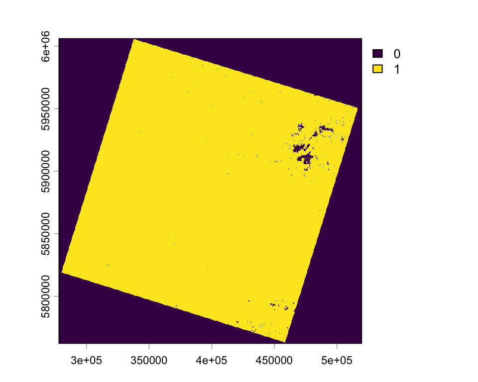 The l8mask image now contains 1s (TRUE) for clear pixels and 0s (FALSE) for everything else (cloud/shadow/fill). We can apply this binary mask to the Landsat-8 image, replacing non-valid pixels with NA (this may take few minutes):