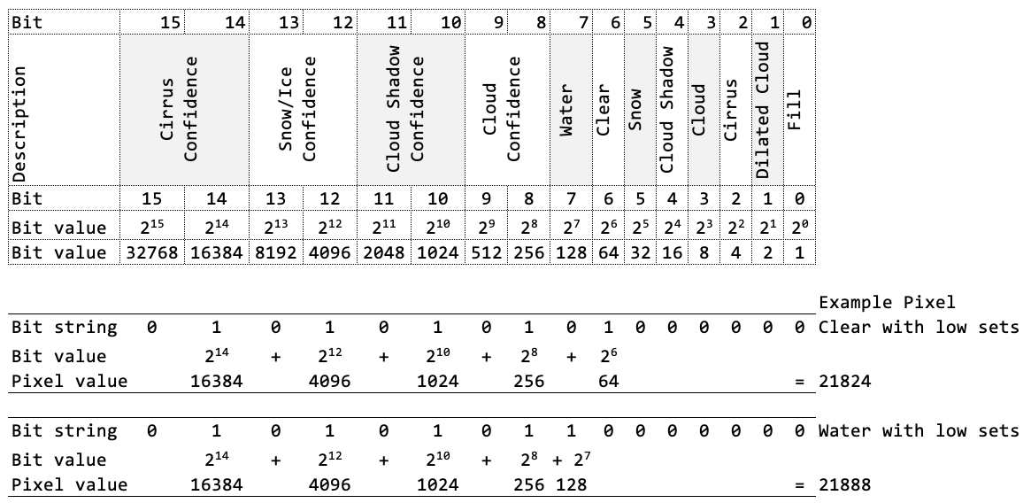 | Pixel Value | Fill | Dilated Cloud | Cirrus | Cloud | Cloud Shadow | Snow | Clear | Water | Cloud Conf. | Cloud Shadow.Conf. | Snow .Ice.Conf. | Cirrus Conf. | Pixel Description |
