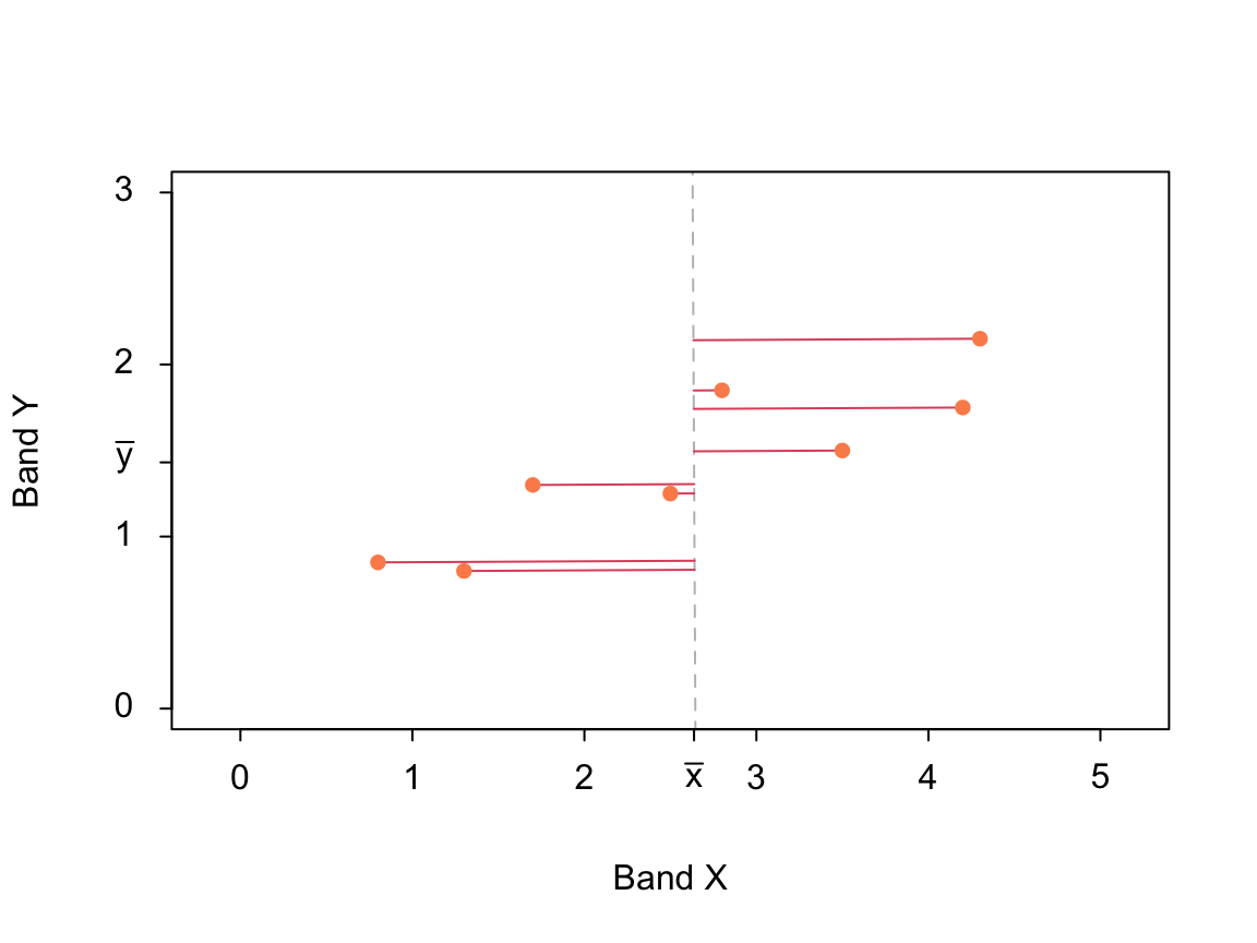 Let’s look at some made up dataset with variables \(X\) and \(Y\) (Figure 13.1). The vertical dashed grey line denotes the mean of \(X\) \((\bar x)\). The horizontal red lines represent the differences between observations \((x_i)\) and their mean \((\bar x)\). Thus, the variance is the mean of the red lines’ lengths\(^2\).