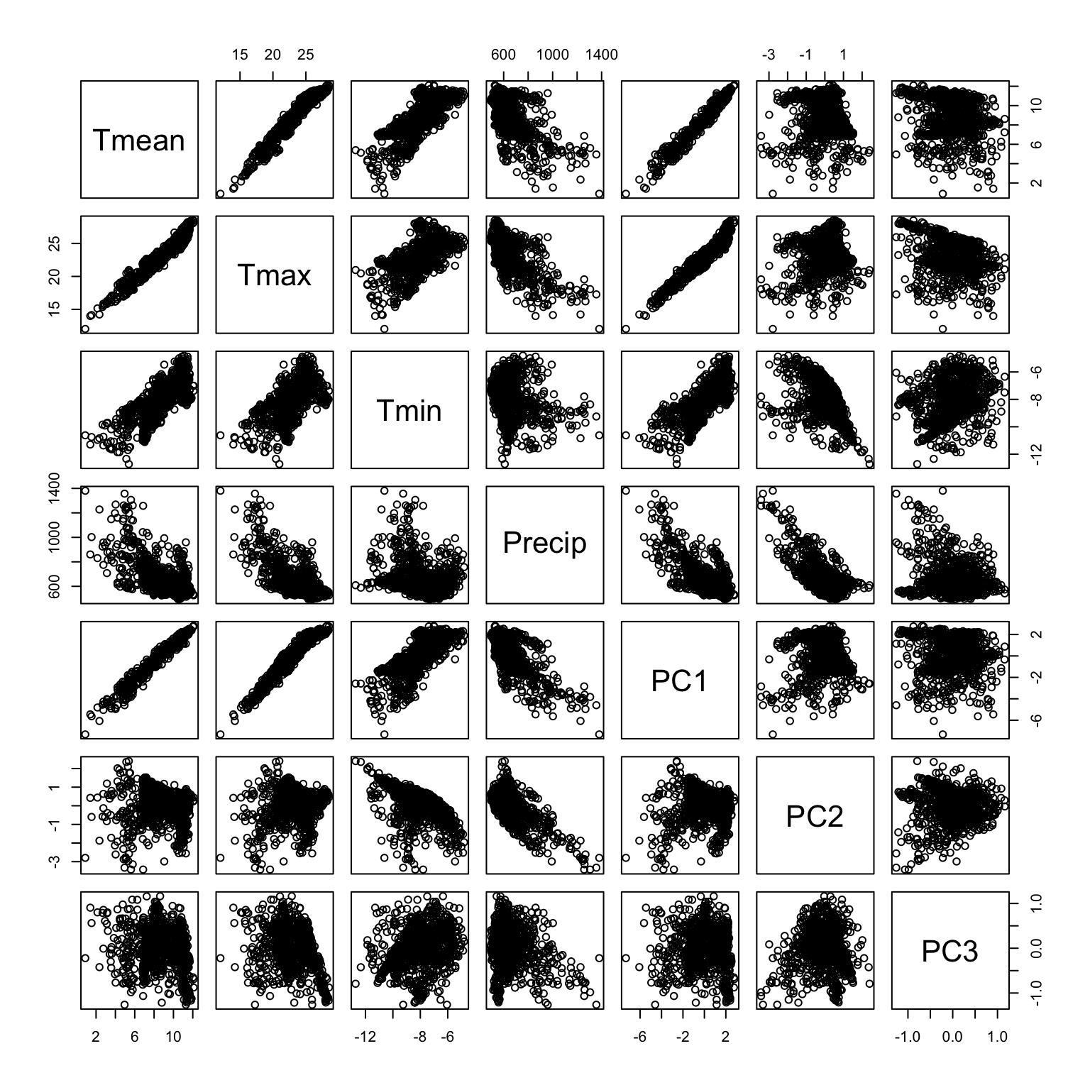\[ PC1 = 0.567 * Tmean + 0.556 * Tmax + 0.456 * Tmin + -0.401 *Precip \]