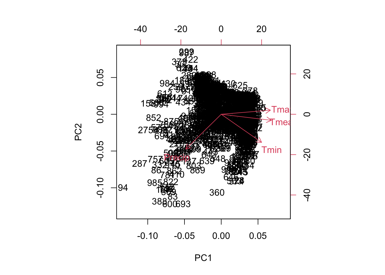 So, do not get attached to the direction of the PC1. But what the signs tell us is: \(Tmean\), \(Tmax\), and \(Tmin\) have an opposite sign to \(Precip\). We can also say: \(Tmean\), \(Tmax\), and \(Tmin\) form a contrast to \(Precip\) (while one has a positive effect the other has a negative effect or vice versa). Now, to interpret what that means requires scientific knowledge of the underlying ecological, climatological, biological, or socio-ecological gradients you might be observing here, e.g. elevation gradients, continentality, etc.