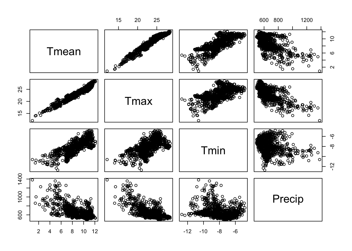 A look at the scatter plot matrix shows that Tmean and Tmax are strongly correlated with each other and that both variables are also correlated to some degree with Tmin. If we were to use these four variables in a regression model, we would face the issue of multicollinearity. Statistical inference for regression models hat contain intercorrelations among two or more independent variables is less reliable as multicolinearity leads to wider confidence intervals. In this case, it will likely be difficult to tell whether an effect is due to Tmean or Tmax. One way to reduce multicollinearity is to eliminate variables based on correlation coefficients or scientific knowledge. Often this is an effective approach if there is prior knowledge regarding the variables, but it can be cumbersome for larger sets of predictors. Another approach is the principal component analysis, which reduces the dimensionality (less predictors are needed) and it yields uncorrelated predictors.
