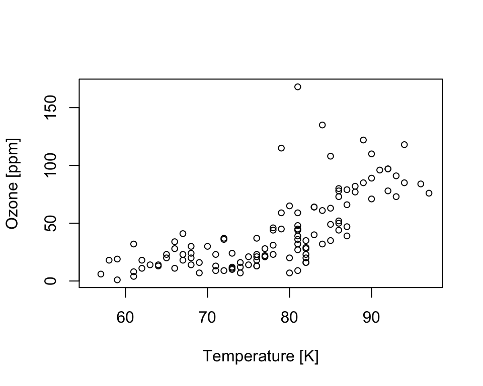 xlab='Temperature [K]', ylab='Ozone [ppm]')