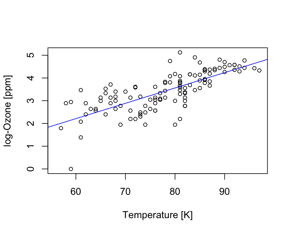 xlab='Temperature [K]', ylab='log-Ozone [ppm]')