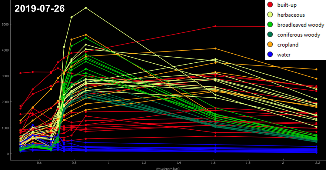 Last week you explored the spectral signatures of the six land cover classes built-up, herbaceous, deciduous woody, evergreen woody, cropland and water in the Sentinel-2 image from the 26th of July 2019:
