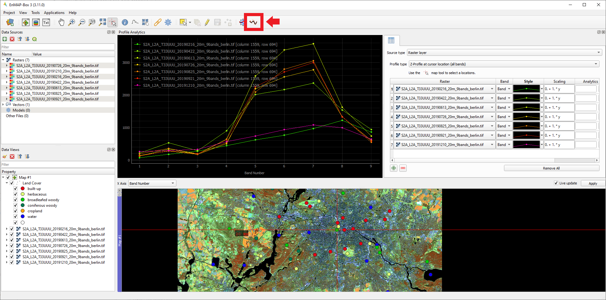 Navigate to some of your sampled points and identify the spectral-profiles for the specific land cover types for the seven time steps: